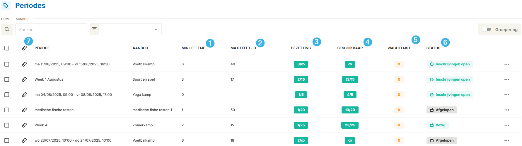 - Bezetting (X/Y): Het aantal inschrijvingen (X) versus de maximale bezetting (Y) zonder wachtlijst.