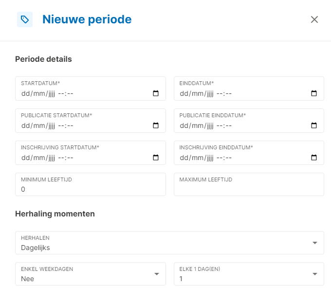 Alle deelnemers worden ingeschreven per periode van de activiteit. Een activiteit moet minstens één periode hebben. Als de periode is afgelopen, moet je een nieuwe periode aanmaken.