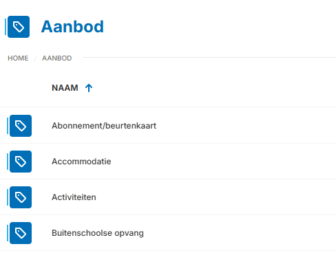 Er bestaan verschillende aanbodtypes. Deze worden bij de opstart door de medewerkers van Luwio ingesteld in samenspraak met u. Achter deze types zit bepaalde functionaliteit, zoals bijvoorbeeld "Krijgen de deelnemers een fiscale attest?" Op de front-office (webshop) kan u deze aanbodtypes ook terugvinden. Binnen elk van deze aanbodtypes kan u de product templates en periodes terugvinden.