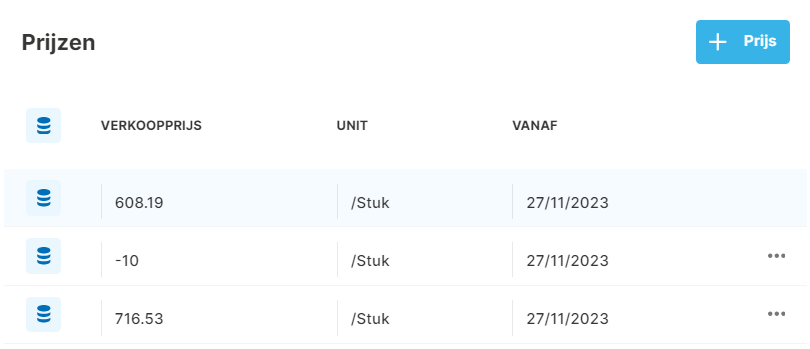 Prijzen kunnen altijd veranderen, om te voorkomen dat het wijzigen van prijzen impact heeft op uw oude inschrijvingen, wordt er een historiek bijgehouden per prijsitem.