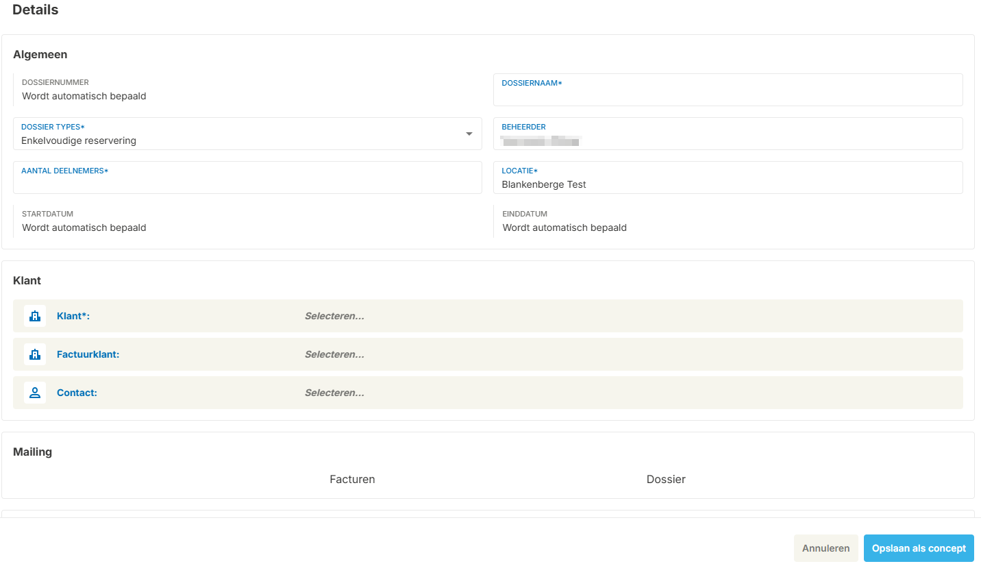 - Vul de verplichte velden in (Dossiernaam, aantal deelnemers, locatie en klant)