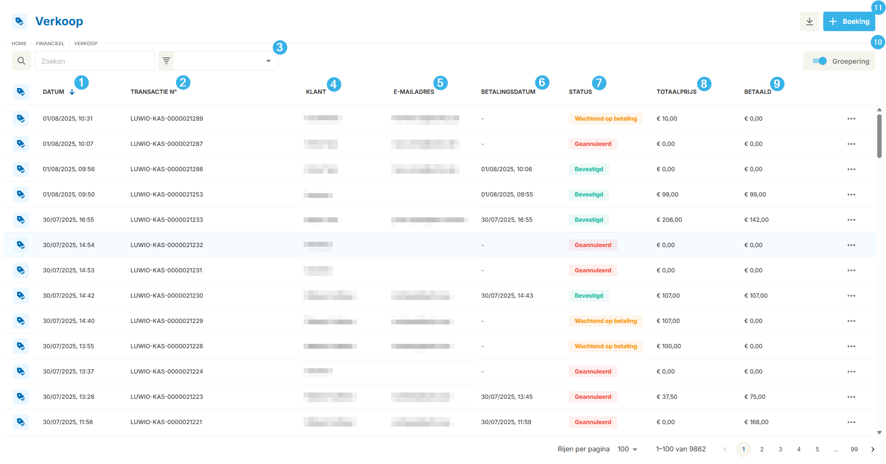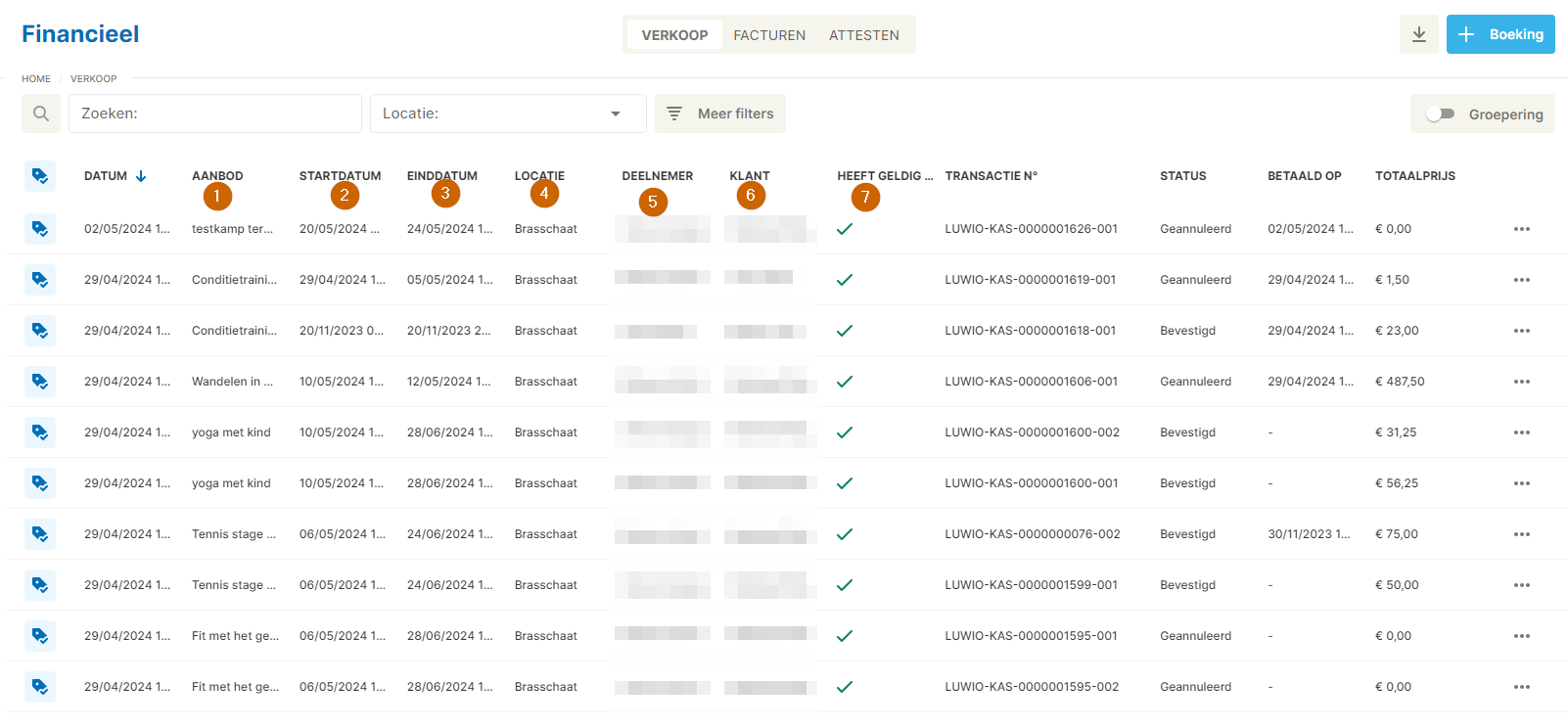 - Transactie n°: De specifiek toegewezen ID-nummer aan elke boeking.