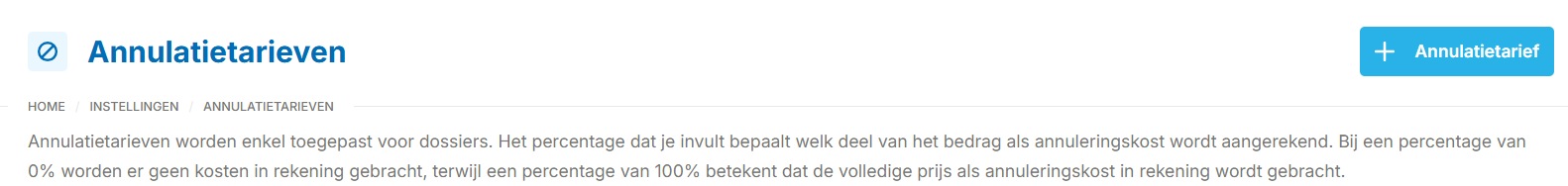 Annulatietarieven worden enkel toegepast voor dossiers. Het percentage dat je invult bepaalt welk deel van het bedrag als annuleringskost wordt aangerekend. Bij een percentage van 0% worden er geen kosten in rekening gebracht, terwijl een percentage van 100% betekent dat de volledige prijs als annuleringskost in rekening wordt gebracht.Was dit artikel nuttig?