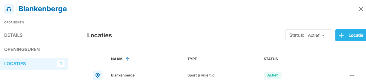 Je kan Locaties vinden bij het het openklikken van een Organisatie onder het tabblad 'Locaties'. Bovendien kan je hier verschillende Locaties aanmaken. Zo maak je makkelijk het onderscheid tussen Organisatie en Locatie.