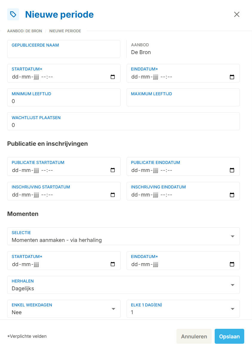 De bedoeling om elk type opvang één keer toe te voegen en elk jaar/seizoen dit te hergebruiken zoals je zou doen bij seizoenactiviteiten. Om een aanbod te hergebruiken kan je een periode toevoegen met een andere start en einddatum.